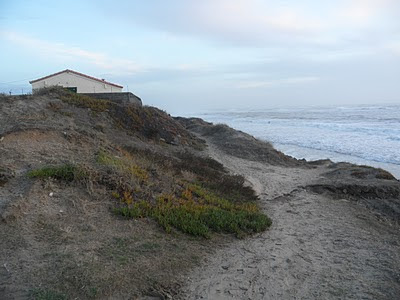 A falésia também provocada pelo esporão tem vindo a recuar com erosão agreste da água do mar e seus temporais, com o salitre e ventos, chegam à estrada nacional