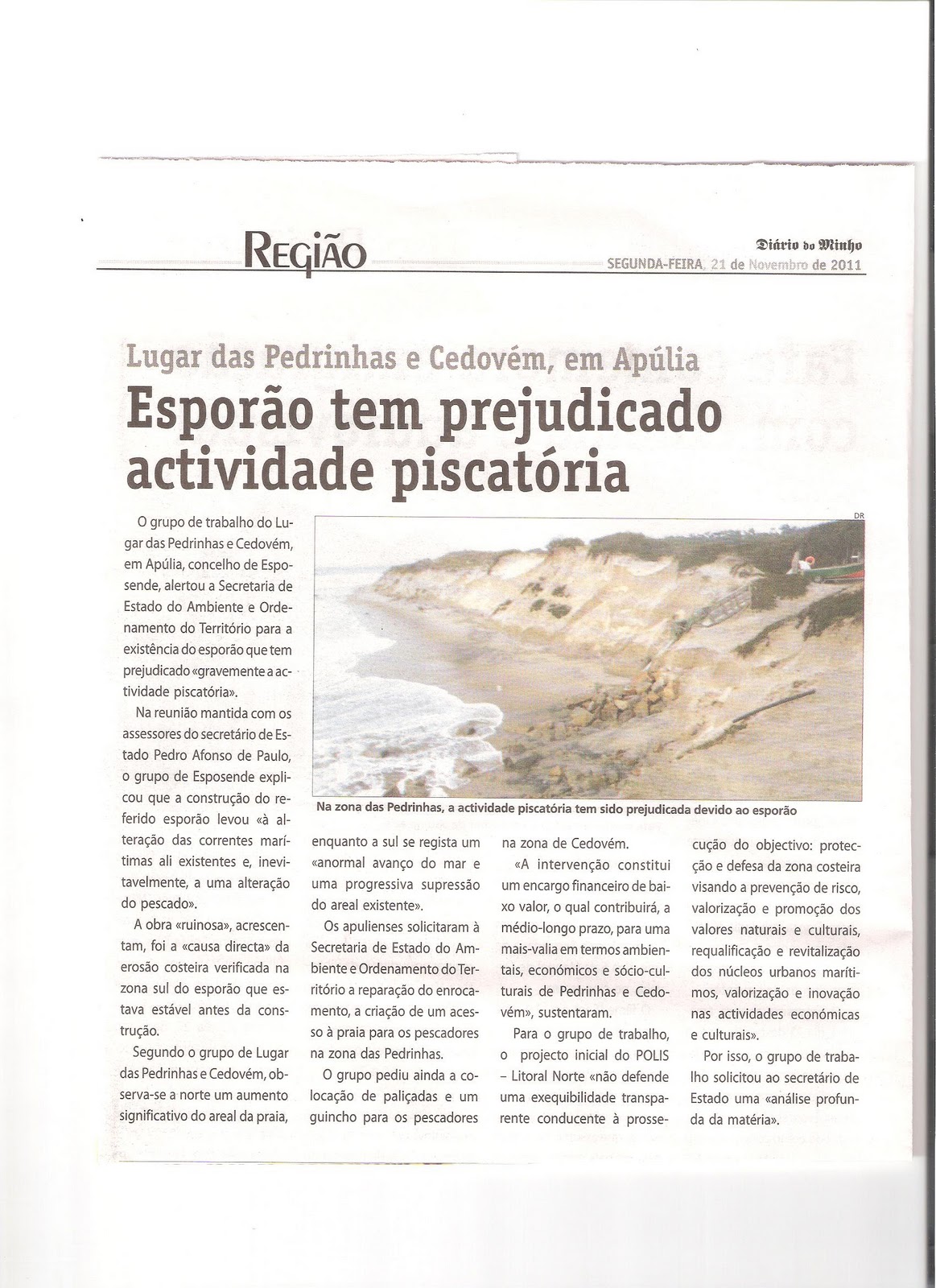 Foi entregue por nossa parte um pedido para que seja reposto todo o enroncamento e um acesso para os pescadores na zona das Pedrinhas, e paliçadas e um guincho para pescadores na zona de Cedovém.