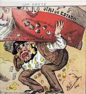 No Principio do Séc. XX, Zé Povinho a carregar a Nau do Estado, com as suas reformas constitucionais, moralidades e economia.